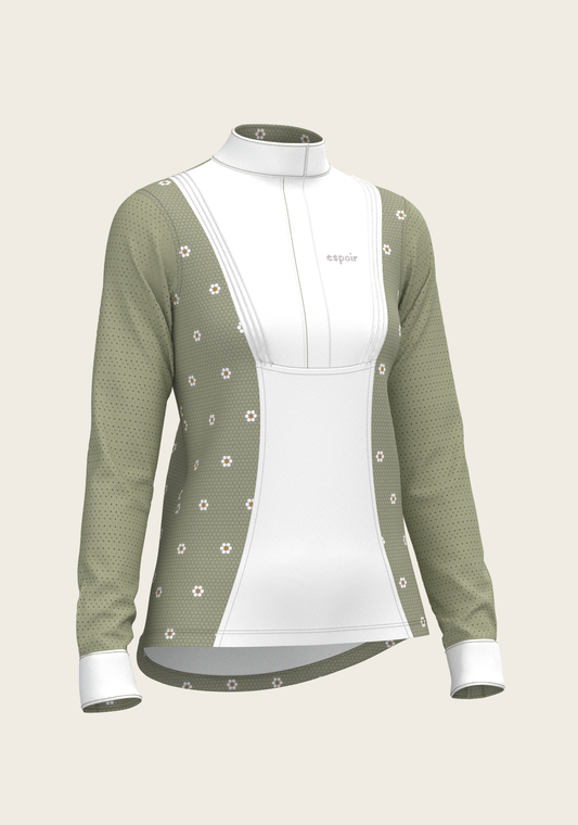 Espoir Long Sleeve Show Shirt, Mosaic Daises in Olive Short Pleated