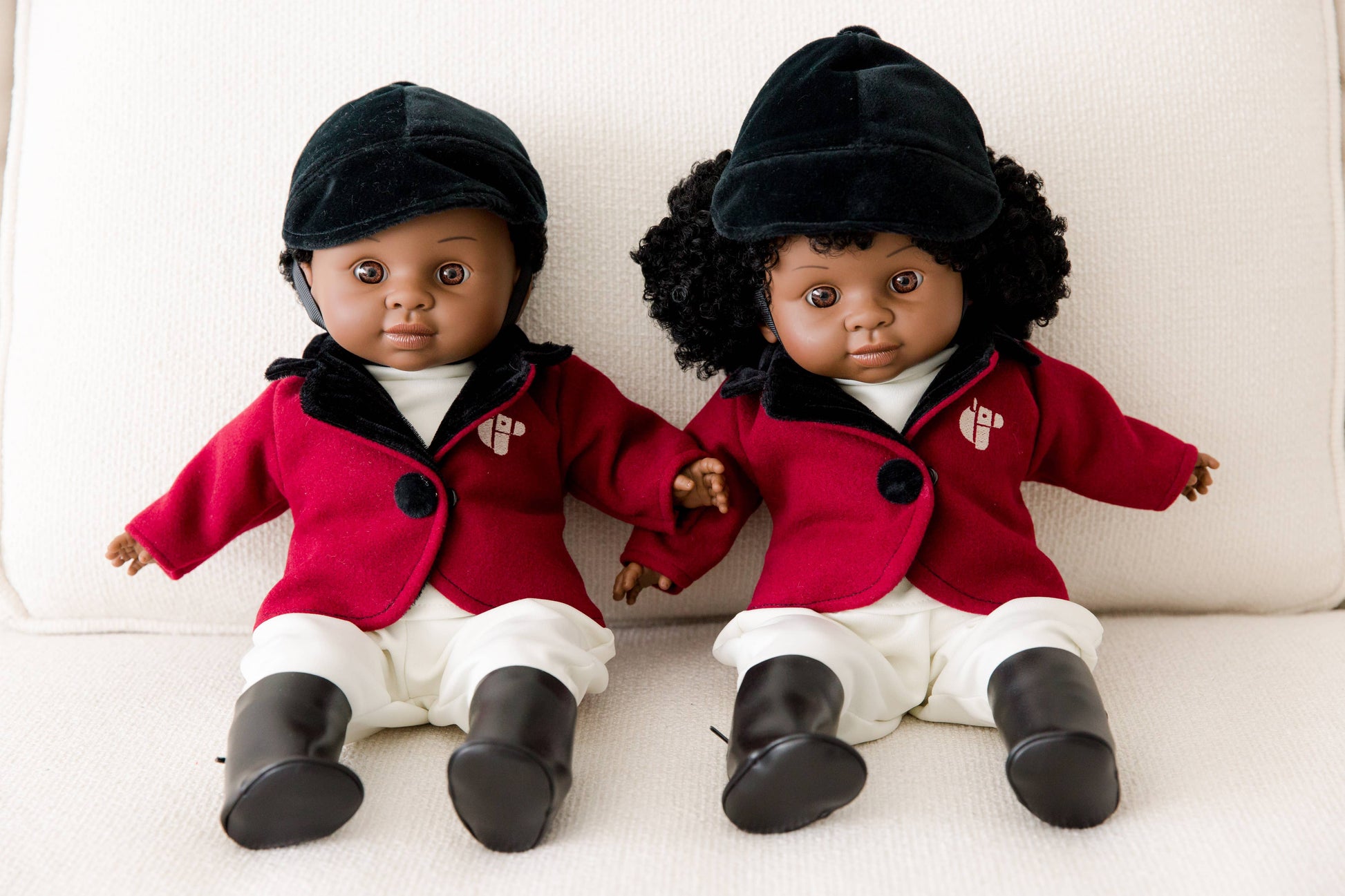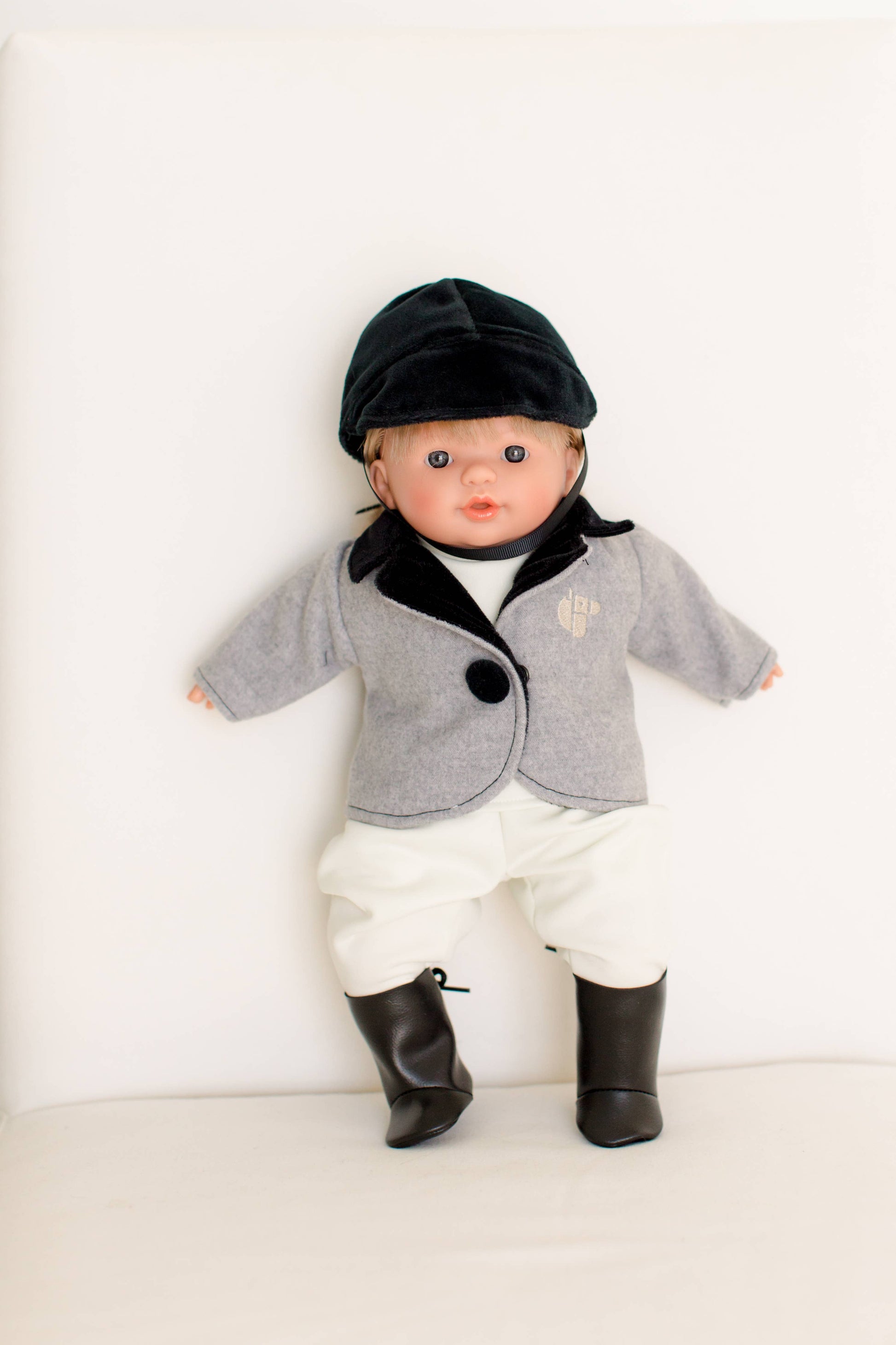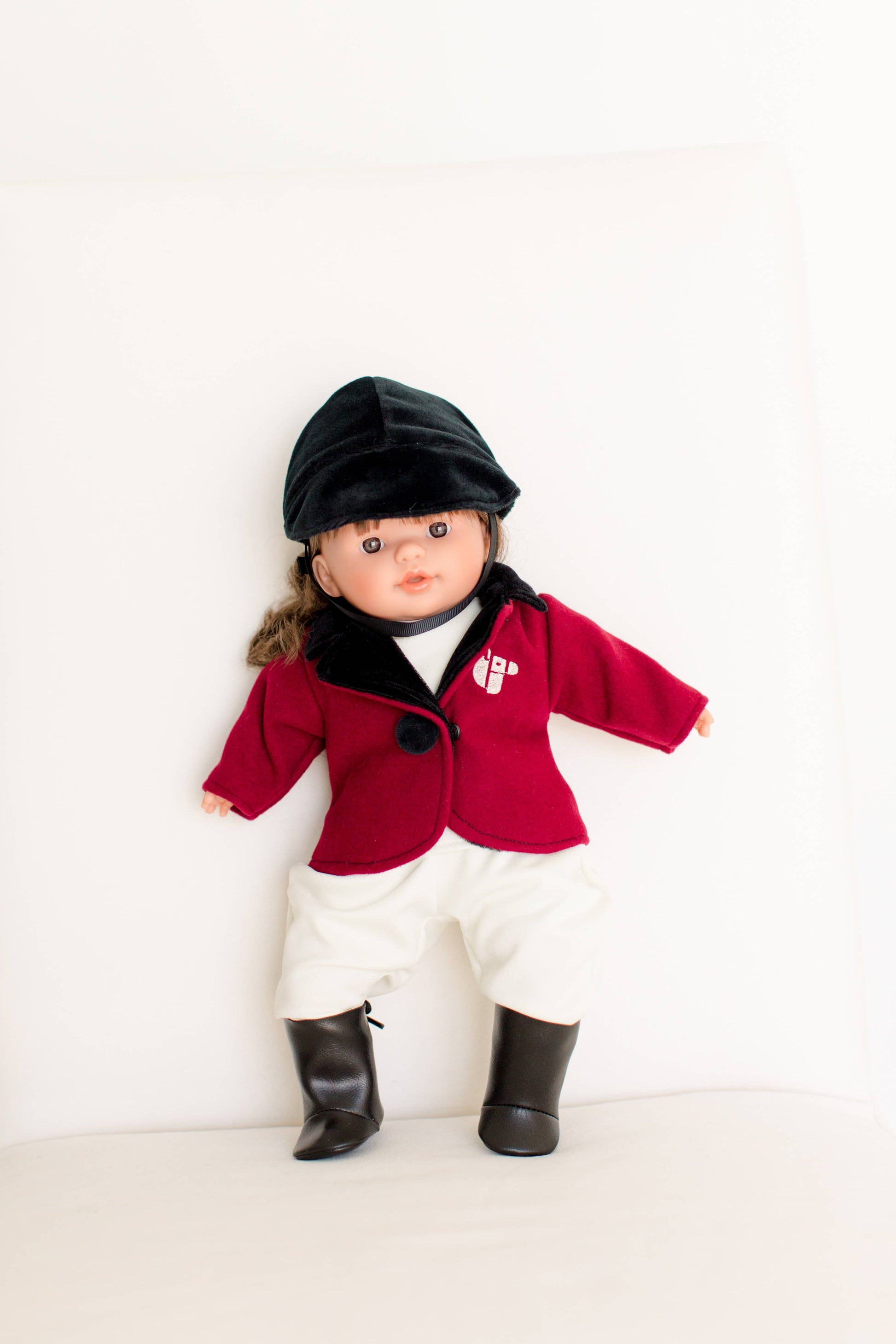 An heirloom treasure handmade in Spain by second generation artisans. Soft-body doll with stunningly beautiful hair, skin and clothing. Doll is dressed in Hunter/Jumper riding outfit with Piccoli plush horse, brush and horse pajamas, all in a beautiful gift box. Perfect gift for the little equestrian.