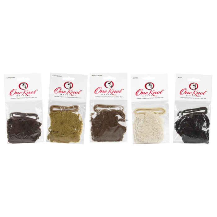 Superior design. "One Knot" Hair Net. Uniquely designed so the knot is tied to the back with a matching hairband leaving NO knot on the riders forehead under the helmet. One size. Washable. 2 per pack.