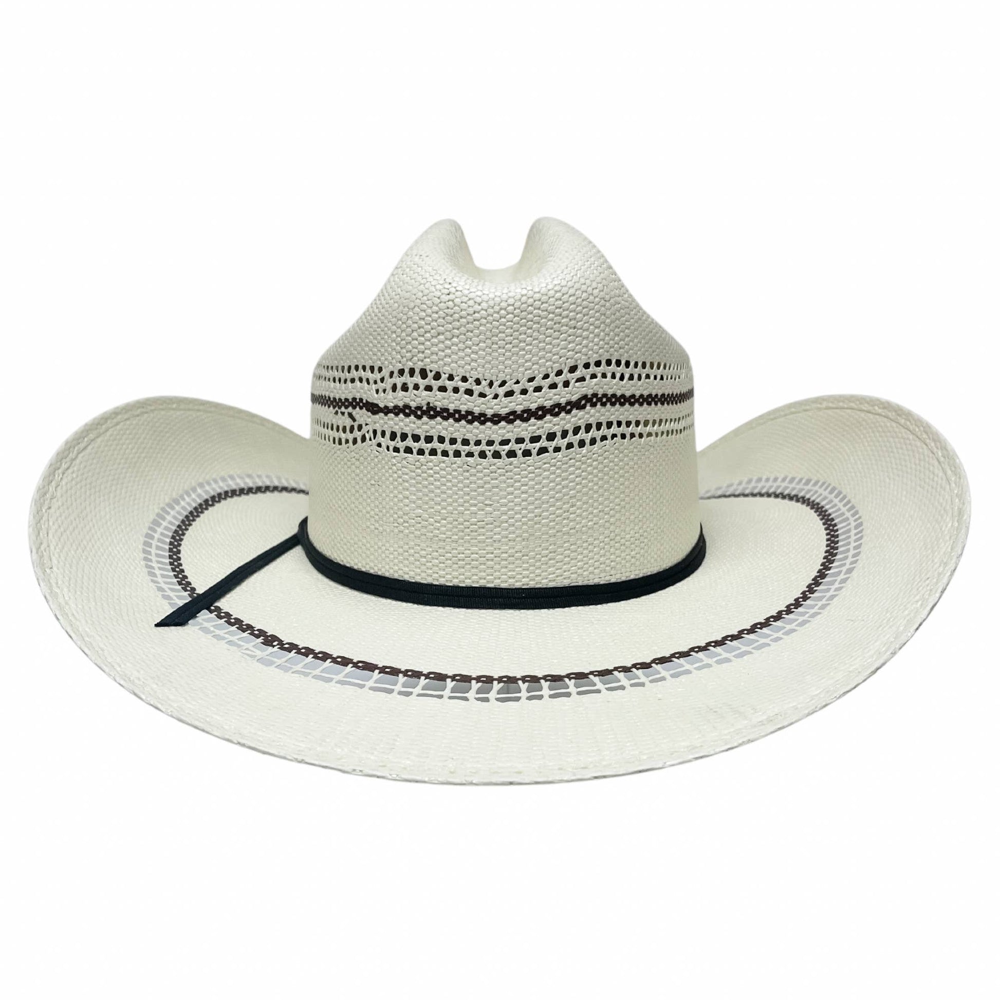 Description - Brim 4" Crown 4 3/4" - Palm Straw Construction - Classic Firm Cowboy Straw - Cattleman Crown - Sewn in Sweatband Introducing the Ponderosa - a wildly stylish and wonderfully functional straw palm hat that's perfect for any sunny adventure! This chic bicolor hat features a small brown band and sewn in sweatband for a comfortable, secure fit. The palm is made of natural straw and features medium sized holes on the brim for optimal airflow and ventilation. Whether you're hitting the beach, hiking in the mountains, or just enjoying a leisurely day in the park, the Ponderosa is sure to keep you cool and protected from the sun.